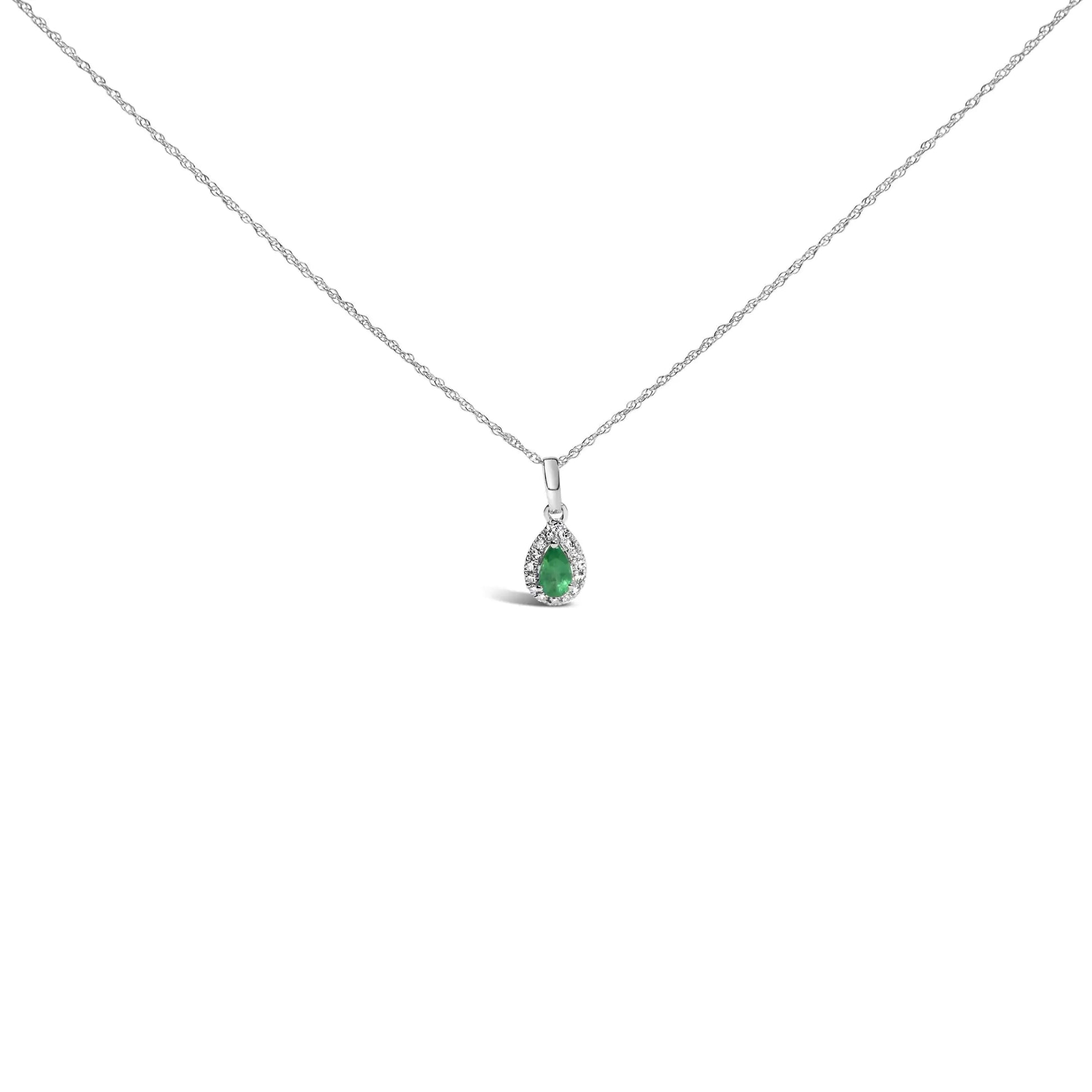 Drape elegance around your neck with this enchanting 10K white gold pendant necklace, where a luscious pear-shaped green emerald takes center stage, enhanced solely by its natural allure. Measuring a delicate 5x3 mm, this gemstone is cradled within a radiant halo of diamonds, each reflecting light with I-J color and I1-I2 clarity, to create a mesmerizing sparkle that dances with every heartbeat. The brilliance of this piece is further amplified by a rhodium-plated finish, ensuring it shines as brightly as the wearer's sophisticated charm. Gently suspended on an 18-inch rope chain that clasps effortlessly with a spring ring, this necklace promises not just to adorn but to add a poetic touch to any ensemble, making it a perfect testament to craftsmanship and timeless style. Gemstone is color enhanced.
