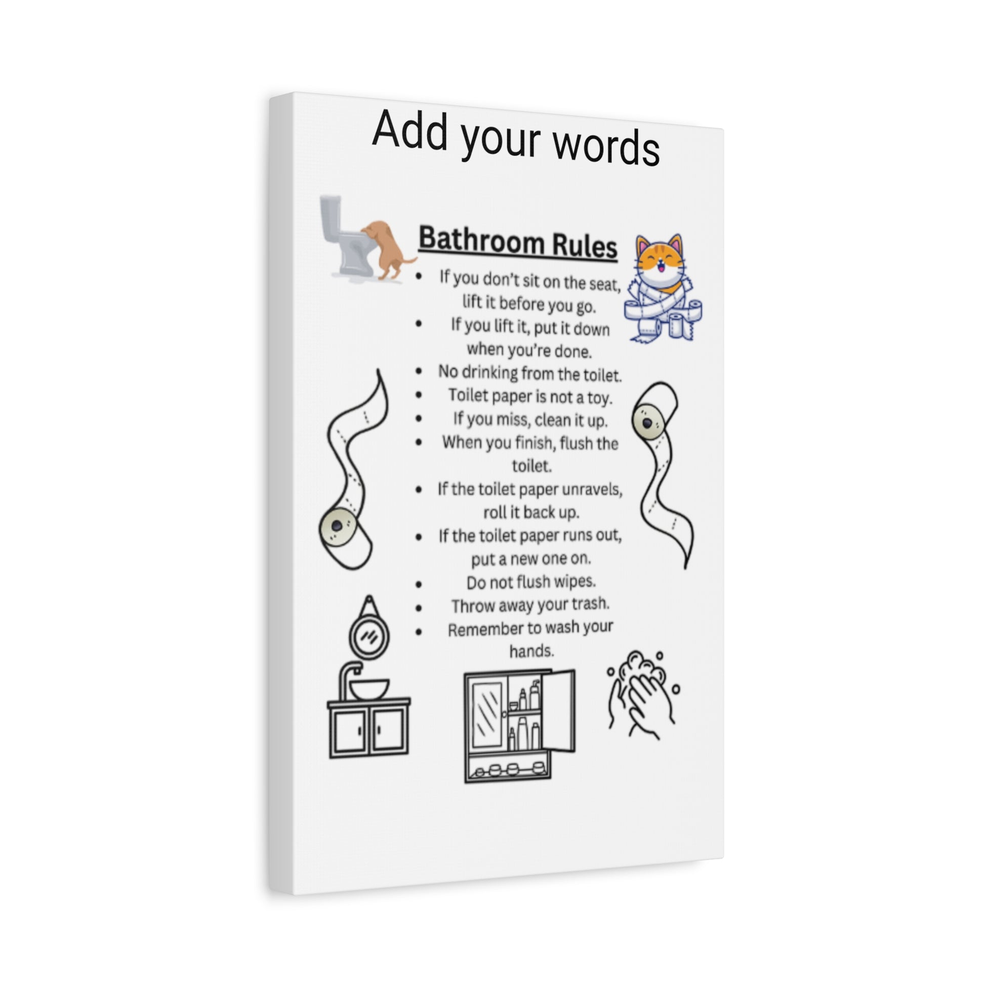 Transform your space with this stylish Matte Canvas art piece. Perfect for adding a touch of personality to your bathroom, this canvas features whimsical bathroom rules presented in a fun, engaging design. The light-hearted tone makes it an excellent conversation starter and a gentle reminder for guests. Ideal for quirky home decorators, new homeowners, or anyone looking to spruce up their restroom decor. This product is great for housewarming gifts, birthdays, or even holiday gatherings, providing a delightful atmosphere that resonates with family and friends alike. Celebrate moments of togetherness and laughter with this charming addition to your home.