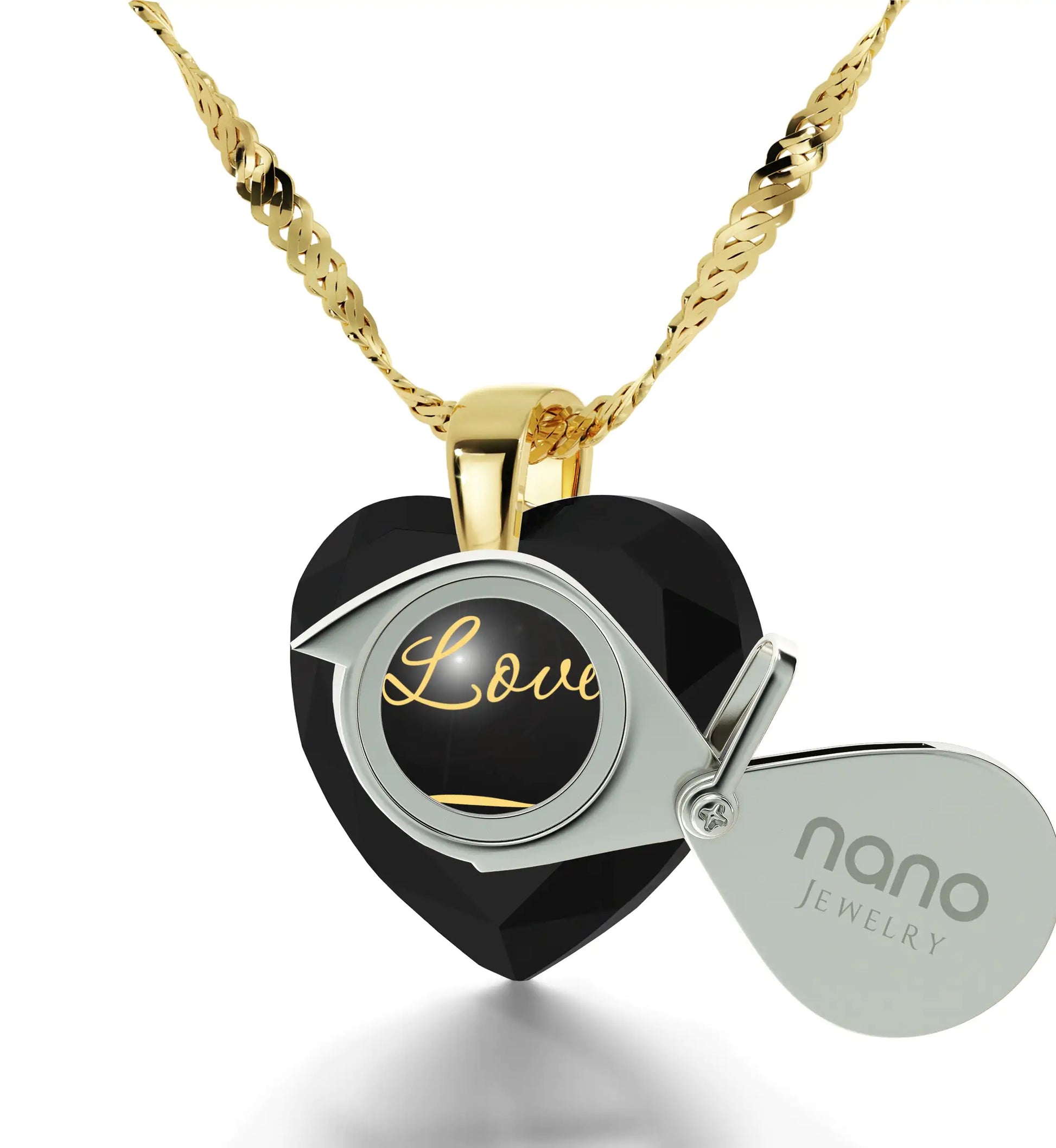 A stunning heart-shaped, faceted cubic zirconia pendant, inscribed with "I Love You" complemented with the infinity symbol in 24k gold.