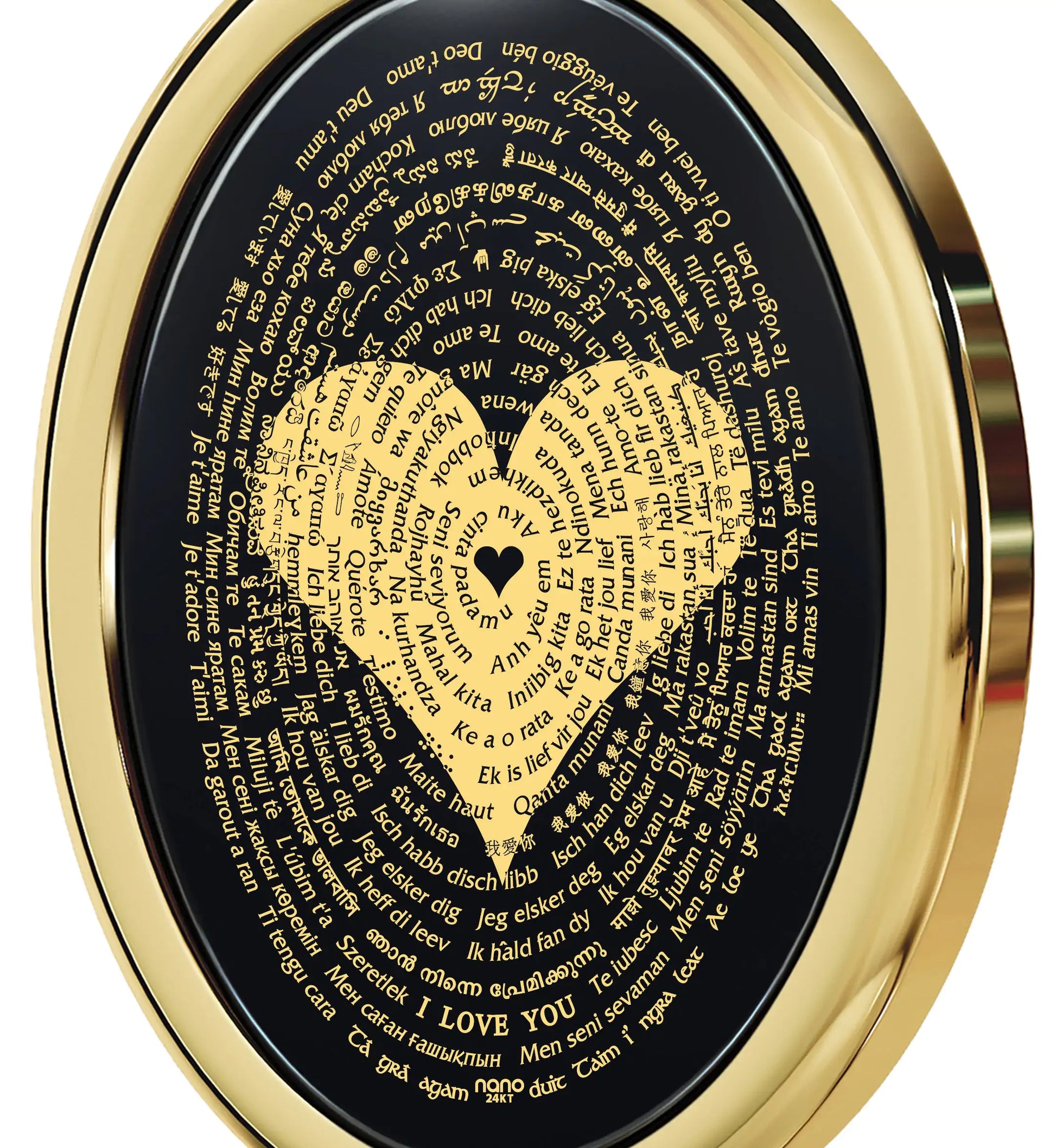 I Love You Necklace Onyx Pendant 24k Gold Inscribed in 120 Languages