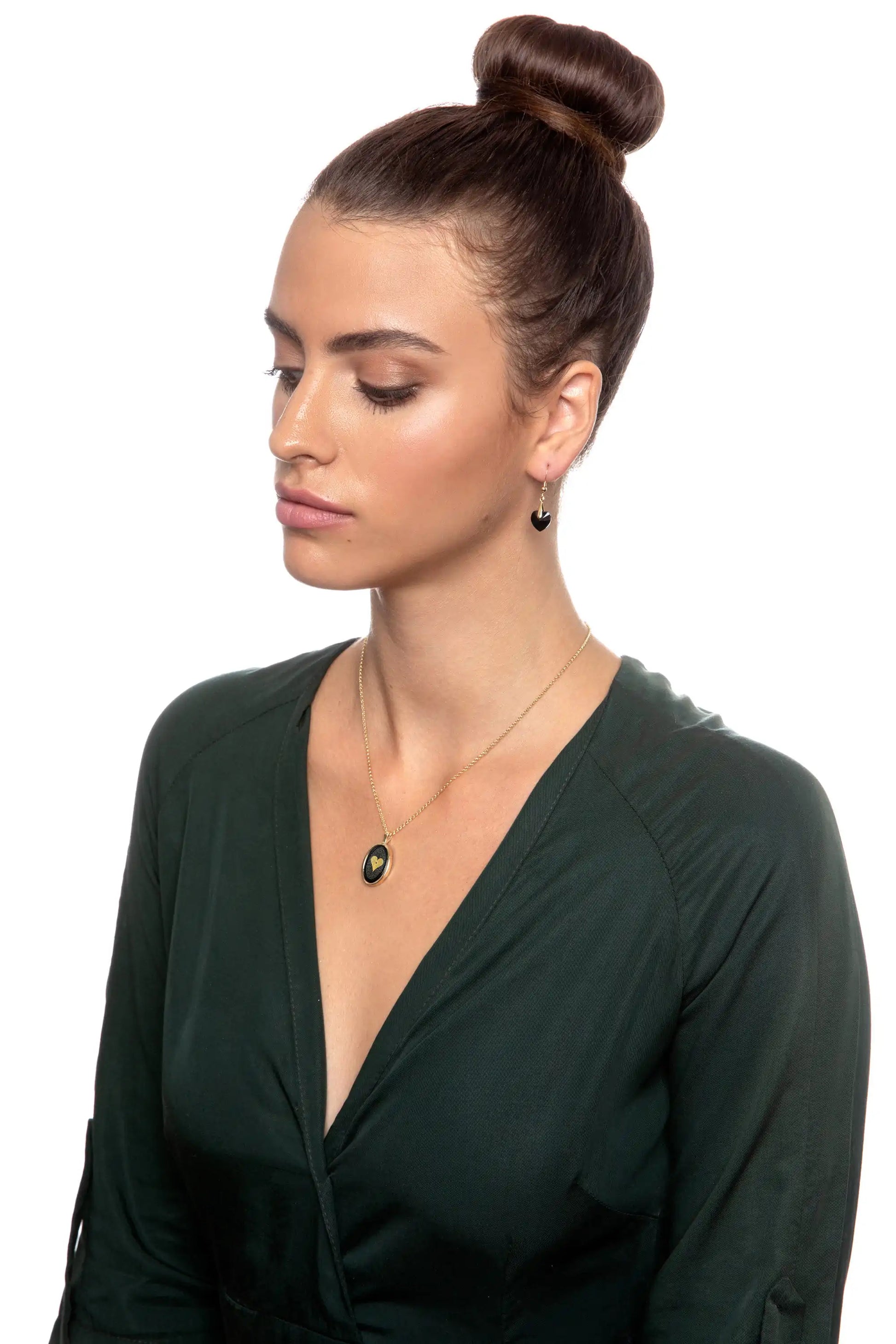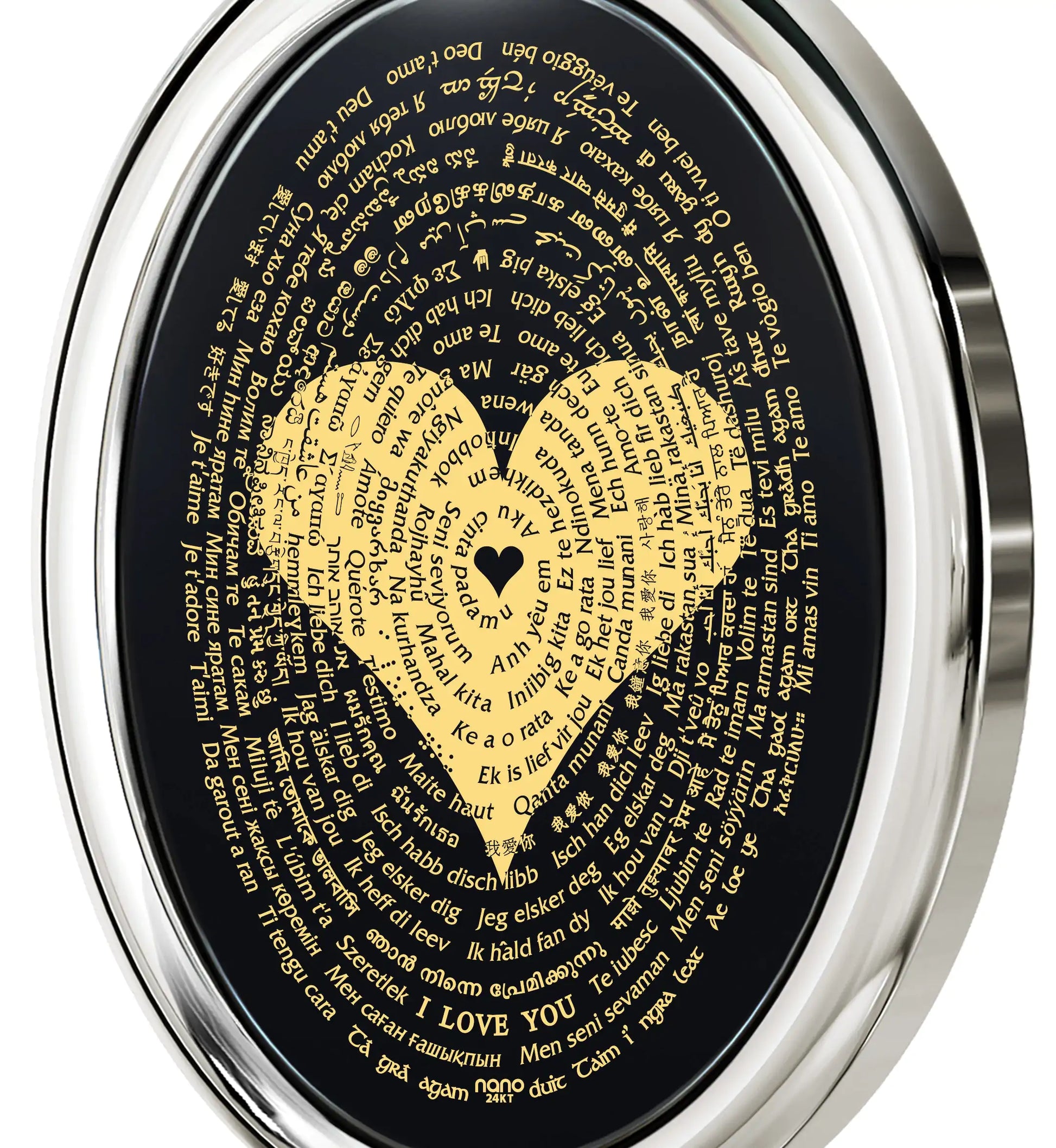 An elegant onyx pendant inscribed with "I love you" in 120 different languages in 24k gold detail and set your choice of oval metal frame.