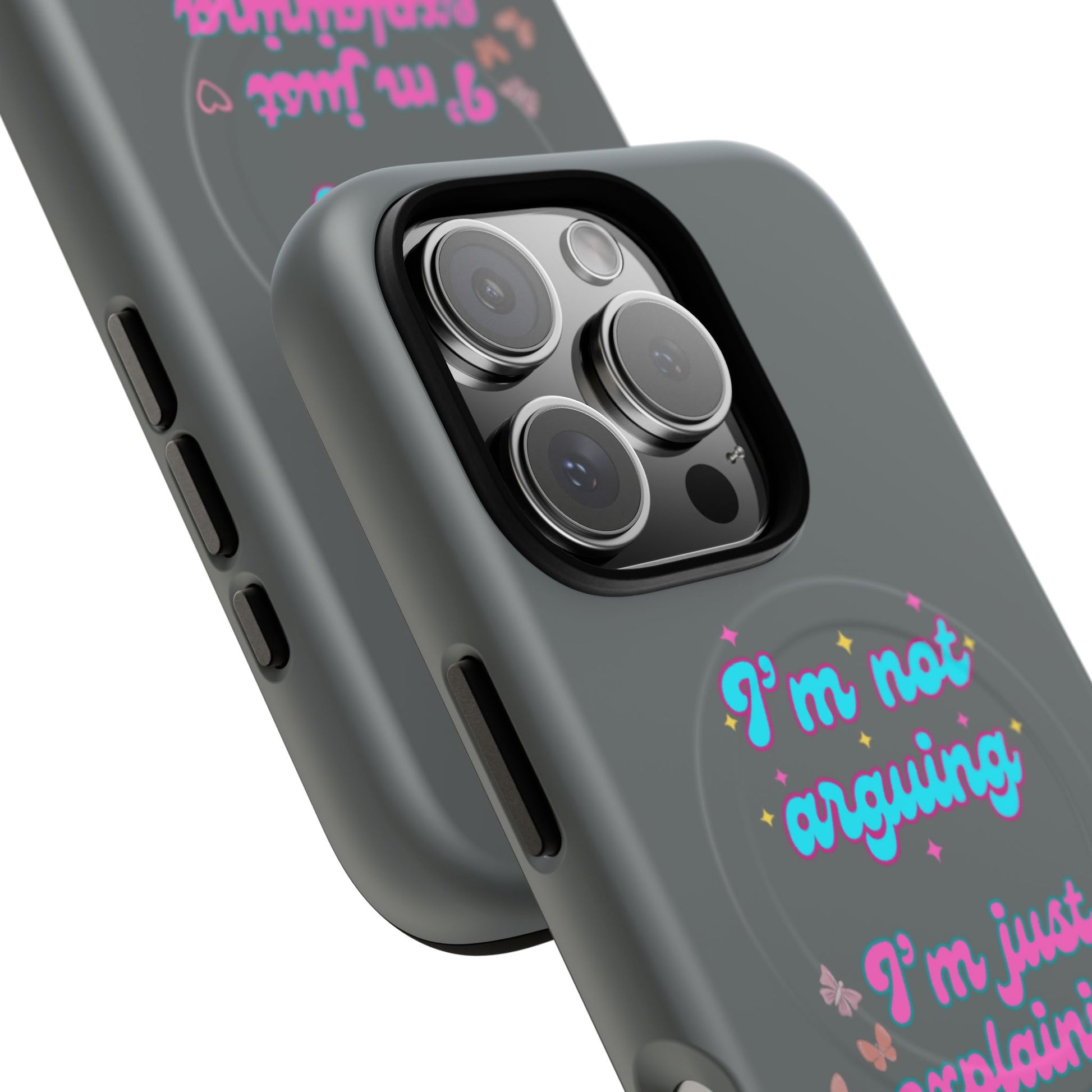 This tough magnetic phone case features a bold design that says 'I'm not arguing, I'm just explaining why I'm right'. It provides durable impact protection and includes a magnetic module compatible with MagSafe® accessories. Perfect for adults who want to protect their phone with style and attitude. Great for birthdays, holidays, or just everyday use.