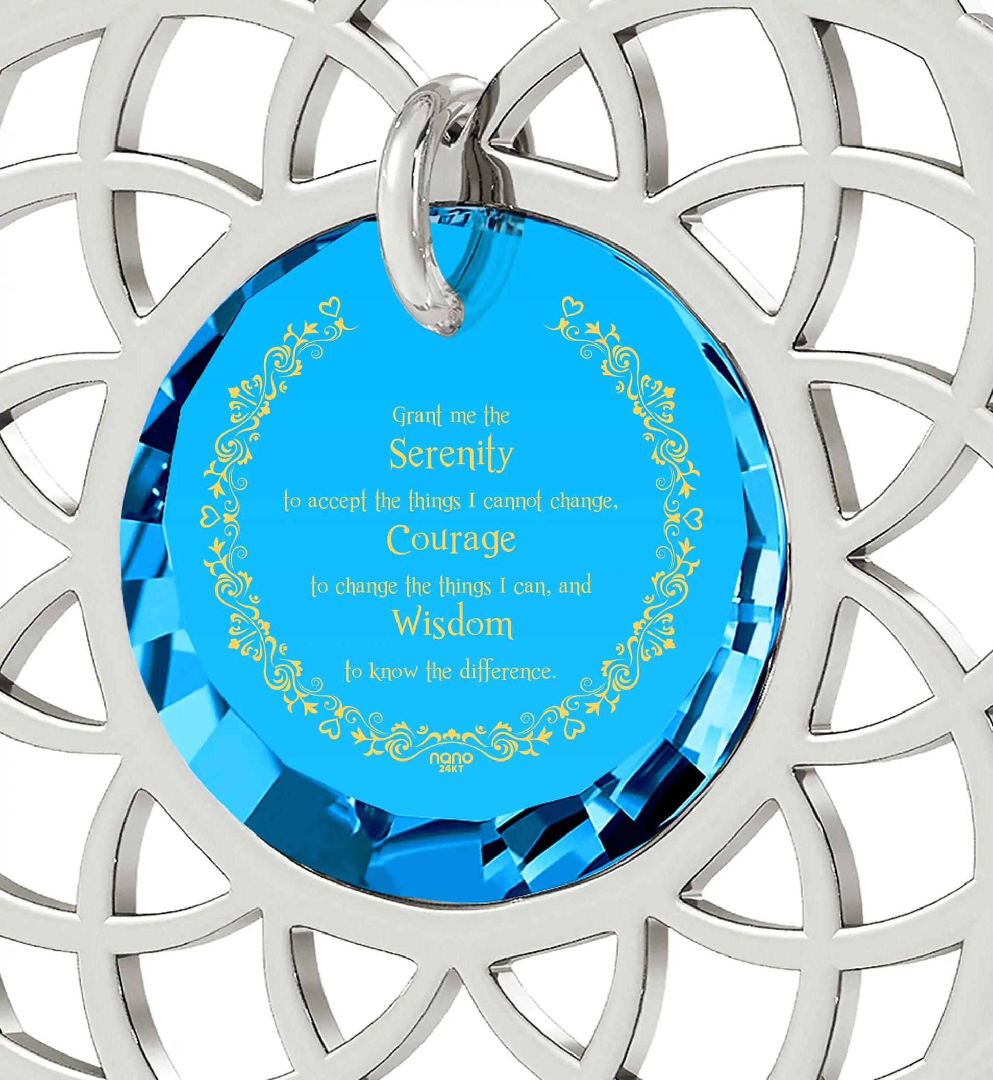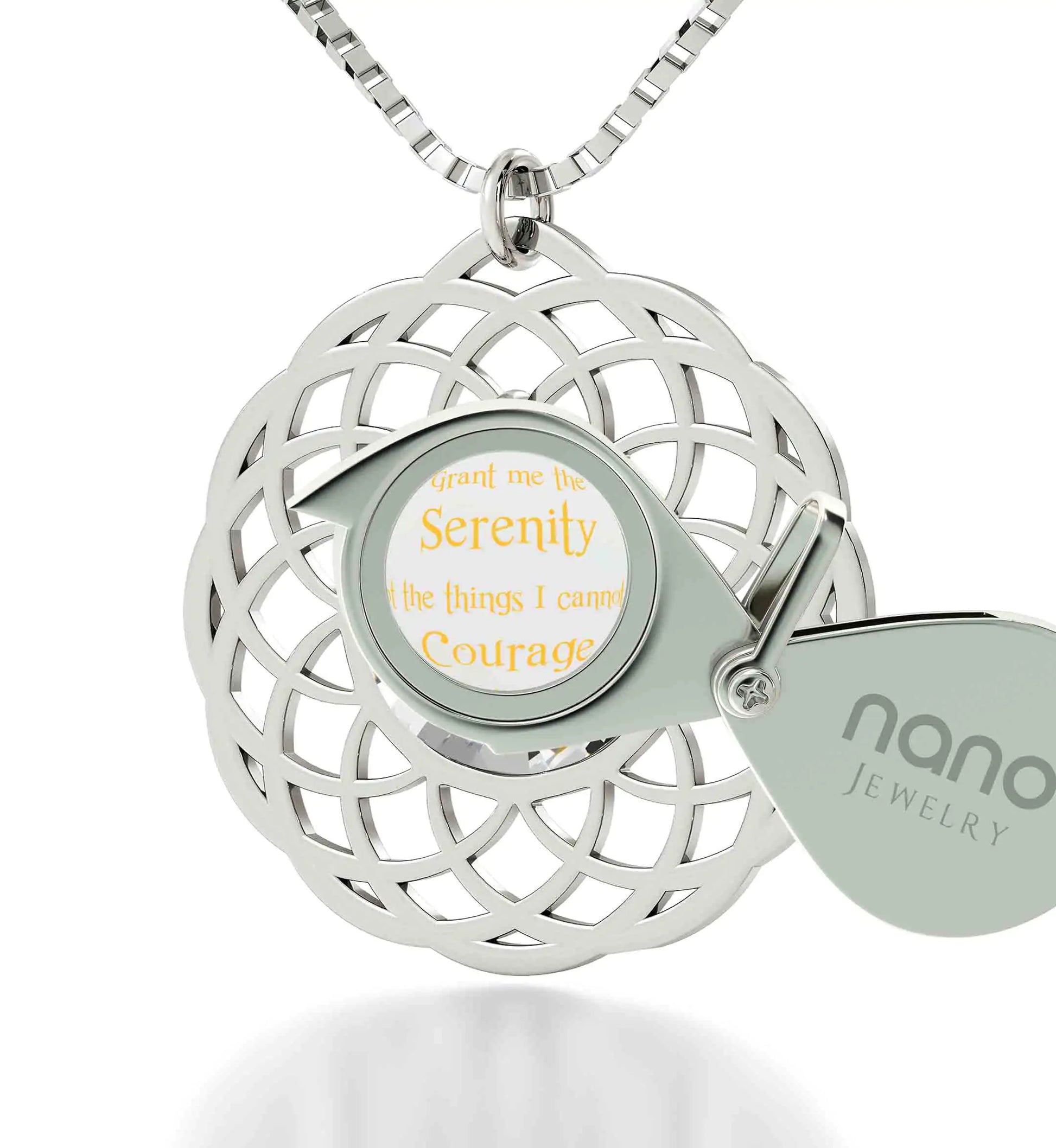 Discover the profound elegance of the Inspirational Serenity Prayer Pendant, a symbol of encouragement and resilience. This pendant beautifully showcases the Serenity prayer, intricately inscribed in radiant 24k gold onto a round cubic zirconia gemstone, elegantly suspended from a 925 sterling silver mandala pendant. Crafted with innovative design, this symbolic jewelry holds the powerful message of accepting what cannot be changed, having the courage to change what can, and the wisdom to know the difference. Whether worn as a personal reminder or gifted to a loved one celebrating a sobriety milestone or seeking comfort, this pendant encapsulates the spirit of transformation and strength in the face of life's challenges.