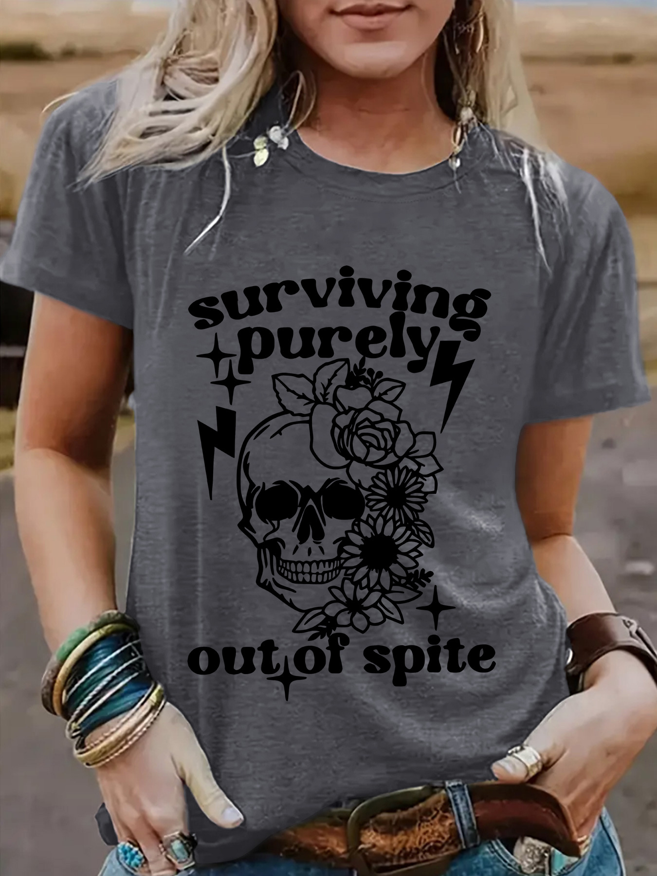 "Surviving Purely Out of Spite" Short-Sleeved T-Shirt with Skull Print